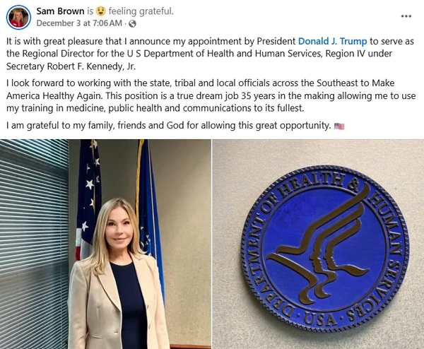 Dr. Brown announced on December 3rd 2025 "It is with great pleasure that I announce my appointment by President Donald J. Trump to serve as the Regional Director for the U S Department of Health and Human Services, Region IV under Secretary Robert F. Kennedy, Jr.
