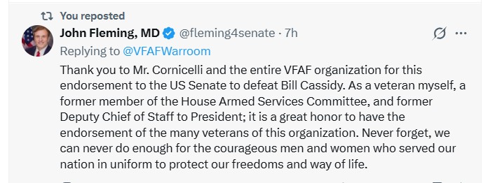 Veterans for America First is proud to endorse Dr. John Fleming for the United States Senate in Louisiana.